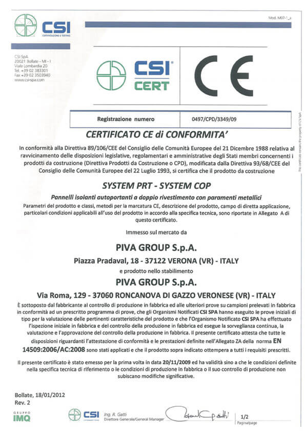 In accordance to the law EN 14509:2006, Pannelli System has obtained the certificate of conformity CE n°CPD/0497/3349/09 in order to label with the mark CE the materials in polyurethane foam called System PRT and System COP.